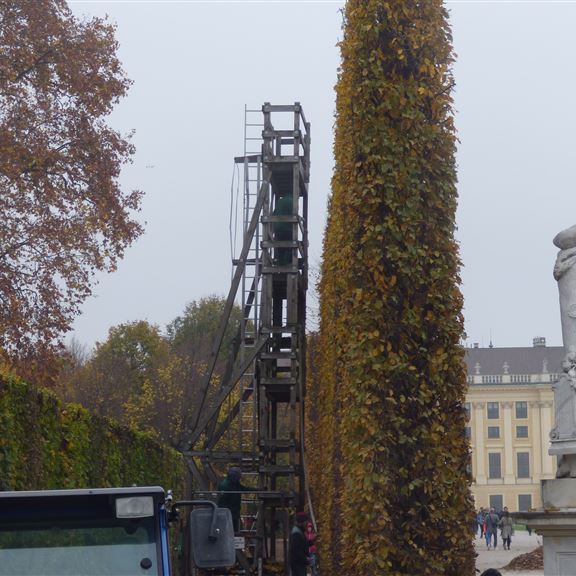 Montag, 31. Oktober: Heute versuchen wir es nochmal in Schönbrunn. Leider spielt das Wetter schon wieder nicht mit. Das hindert uns aber nicht daran einige vernebelte Aufnahmen zu machen… Zwischendrin lüftet sich auch das Geheimnis der akkurat gepflegten Alleenbäume. Mit einer Vorrichtung der besonderen Art legen die Gärtner auf mehreren Stockwerken Hand an….