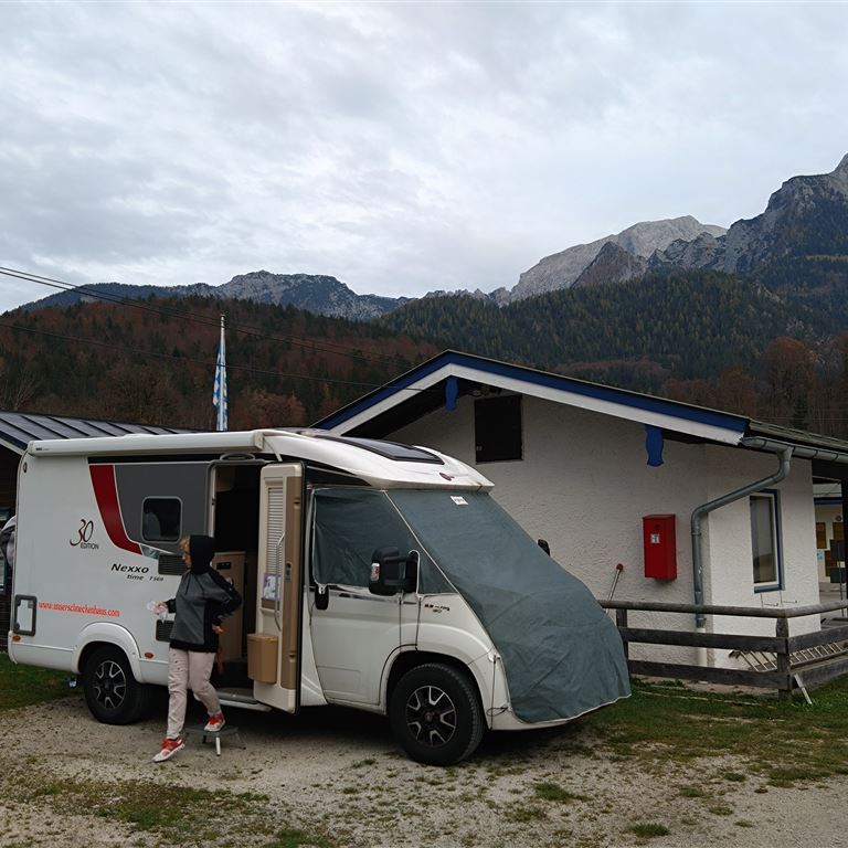 Als nächstes kümmern wir uns um einen Stellplatz für die Nacht. So nahe wie möglich am Königssee soll es sein und so kommen wir zum Campingplatz Grafenlehen in Schönau. Ganz schnell einrichten und eine Aufnahme von der umliegenden Bergwelt machen bevor wir die erste Erkundung starten. In zwei – drei Minuten sind wir in Schönau und laufen die kleine „Shopping Meile“ zum Anleger der Ausflugsschiffe.