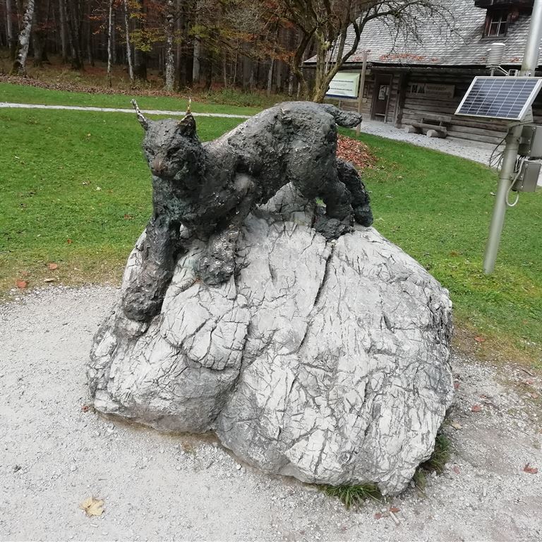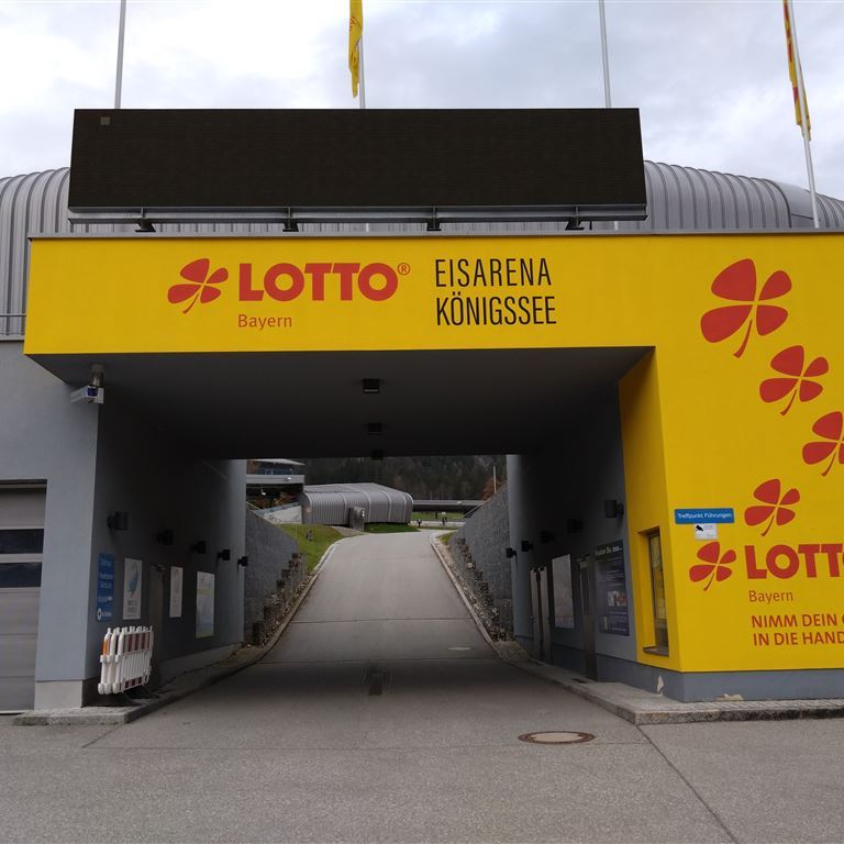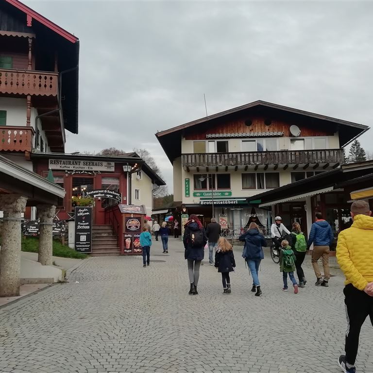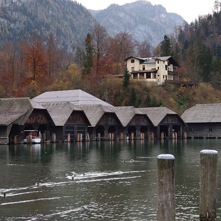 Die Holzbauwerke entlang des Ufers dienen als „Garage“ für die elektrischen Ausflugsschiffe. Wir spazieren am Ufer lang zum Stauwehr der Königsseer Ache und laufen auf der anderen Seite weiter bis zur Seeklause. Da uns die Speisekarte nicht zusagt machen wir kehrt. In der Nachbarschaft steht auch die berühmte Eisarena. Bereits auf dem Hinweg ist uns ein besonderes Restaurant aufgefallen. Die komplette Speisekarte gibt es auch „To Go“. Wir legen uns ganz schnell fest, heute Abend gibt es für jeden Kässpätzle und zum Nachtisch Kaiserschmarrn.