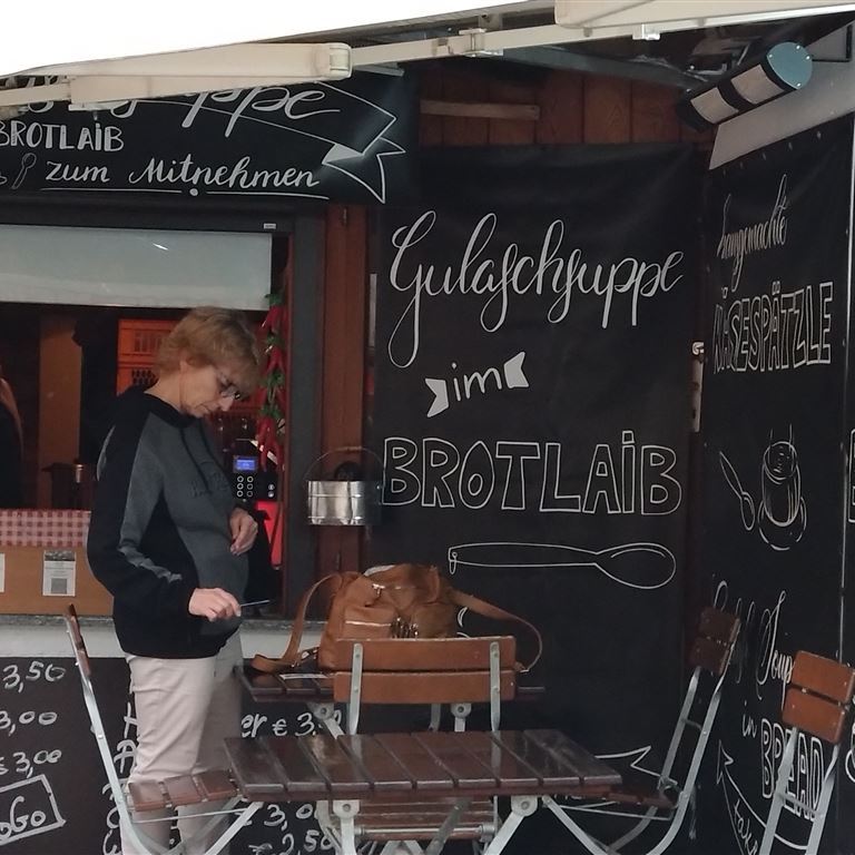 Am Ausgang werden ziemlich große Brezeln mit speziellen Füllungen angeboten. Zum Abendessen probieren wir die Pizza-Variante als Hauptspeise und die mit der Apfelfüllung als Nachspeise. Wir haben zwar Süßes oder Saures besorgt, aber Halloween geht komplett an uns vorbei.