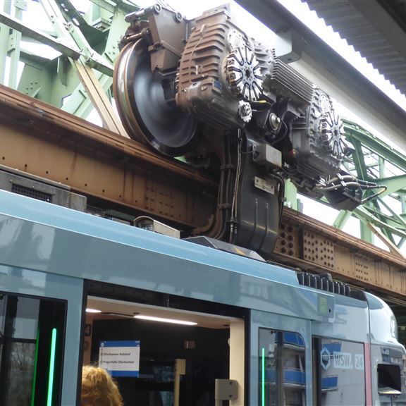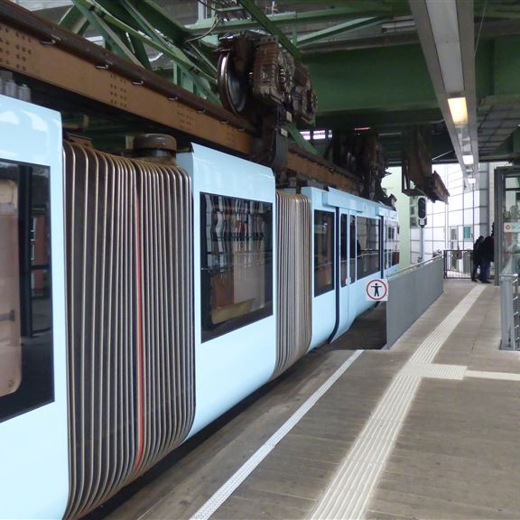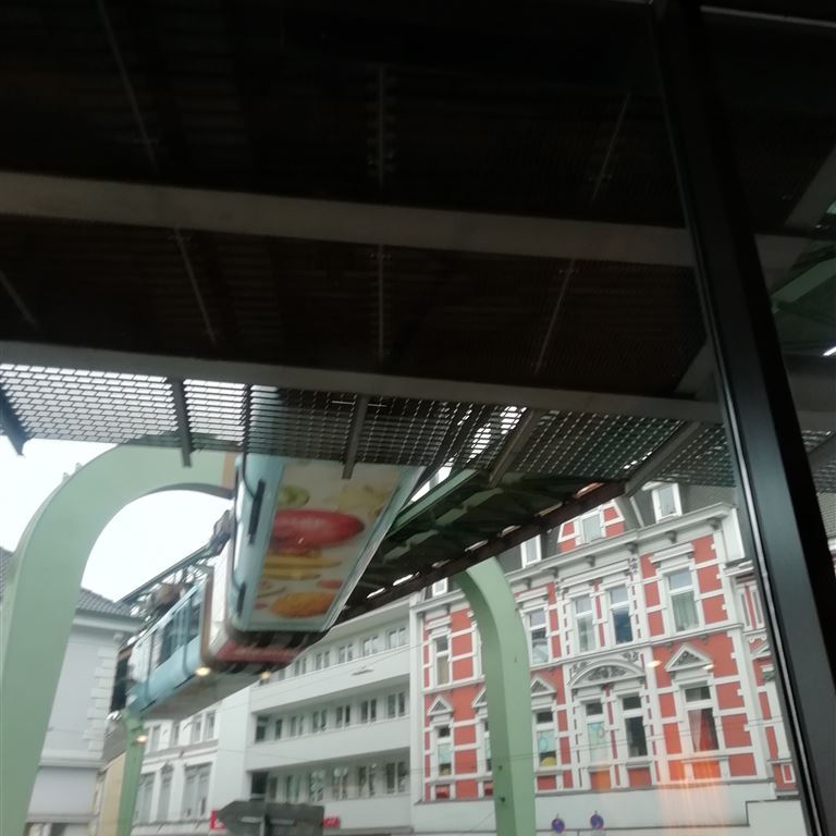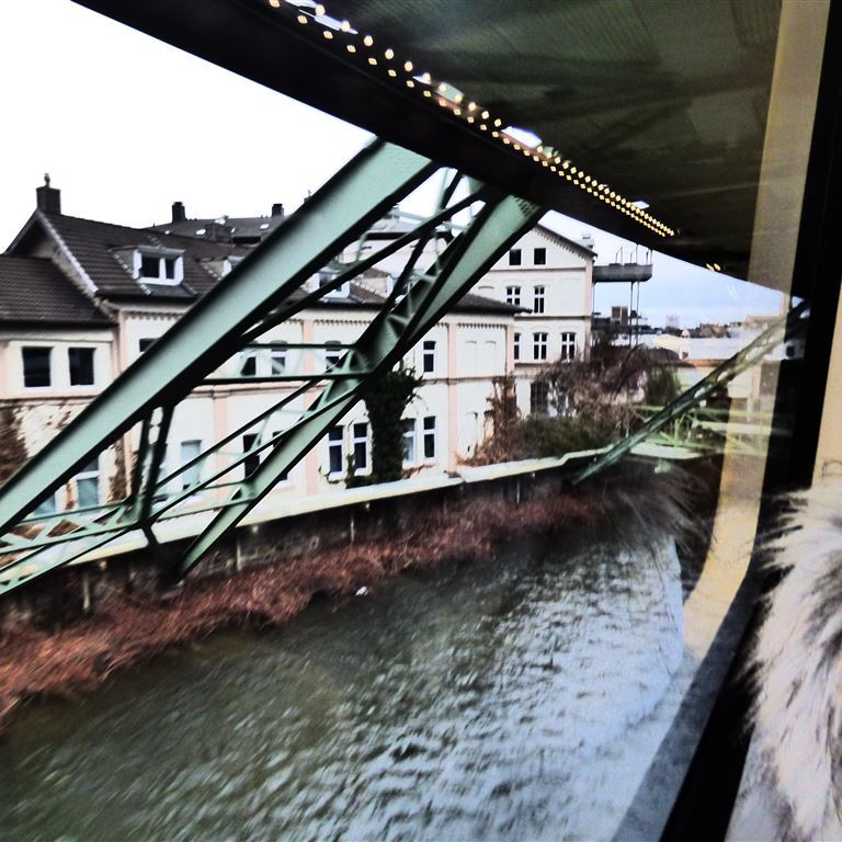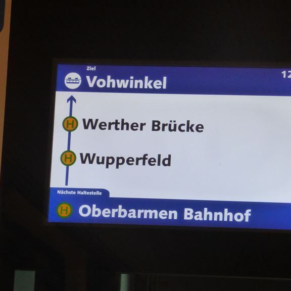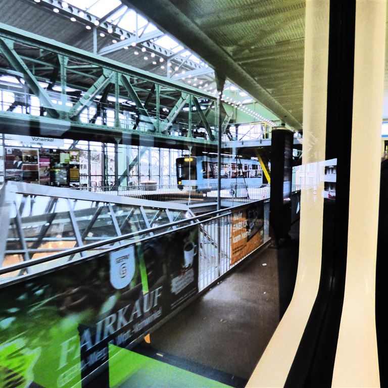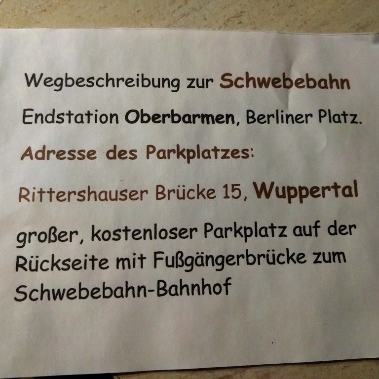Freitag, 30. Dezember: Entgegen unserer Gewohnheiten wird Pompui als Transportmittel genutzt. Die Klappräder stehen zwar auf dem Heckträger bereit, aber für die knapp 18 Kilometer einfache Strecke ist heute kein Wetter. An der Rezeption liegt eine Beschreibung wie man zur Endstation der Schwebebahn in Oberbarmen gelangt. Im nahe gelegenen Industriegebiet finden wir eine große kostenlose Parkfläche und verstecken Pompui zwischen zwei Brummis. Kurze Orientierung, am Automaten gibt es die 24-Stunden-Fahrkarte und zwei, drei Stockwerke darüber fährt die Bahn ab…. Im Erdgeschoß der Station stärken wir uns mit Cappuccino und Bagel und werden sehr gut bedient. Von der netten Dame lernen wir auch, dass man hier nicht „ein gutes neues Jahr“ sondern „einen guten Übergang“ wünscht. Zusätzlich haben wir auch eine tolle Sicht auf die über uns ein- und ausfahrenden Schwebebahnen.