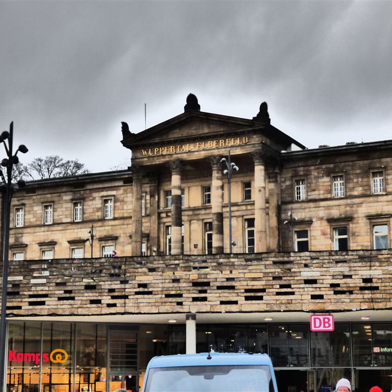 Da wir ja das 24 Stunden Ticket haben fahren zunächst von Endstation zu Endstation. In Vohwinkel steigen wir aus, schauen uns an wie unsere leere Bahn den Kreisverkehr nutzt und dann gegenüber die Fahrgäste für die Rückfahrt einsteigen. Auf der Rückfahrt wird am Hauptbahnhof ausgestiegen. Vorm Gebäude fällt uns sofort das Ortsschild auf und die Loriot kommt in den Sinn. Der Ortsteil heißt nämlich: Wuppertal – Elberfeld. Hier hätte es tatsächlich Möglichkeiten gegeben eine Herren-Butike zu eröffnen…