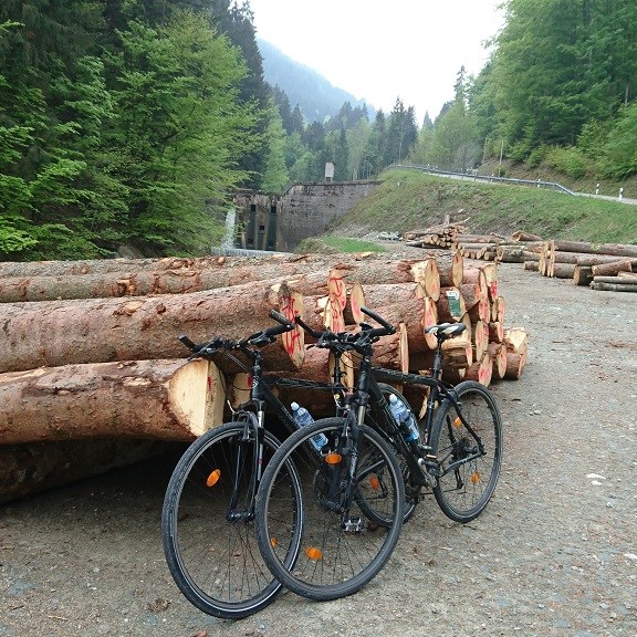 Für das Frühstück gibt es wieder Brötchen vom Bäcker. Leider gibt es die Dinkel-Brezen nur Freitags. Trotz der Demütigung vom Vortag setzen wir uns wieder aufs Rad. Dieses Mal geht es aber nur an der Iller entlang. Von Sonthofen über Blaiach nach Immenstadt und weiter zum Alpsee. Die so genannte Alpsee Bergwelt ist voll auf Tourismus ausgelegt. Segelschule, Segel- und Tretbootverleih, ein Hochseilgarten usw…. Die Pfahlbauten kann man in der Saison mieten.