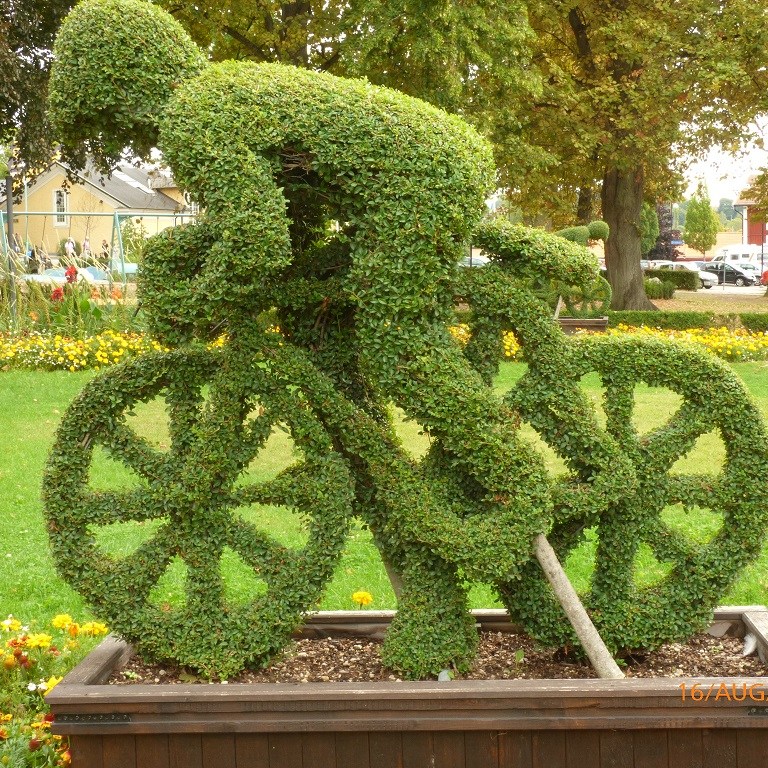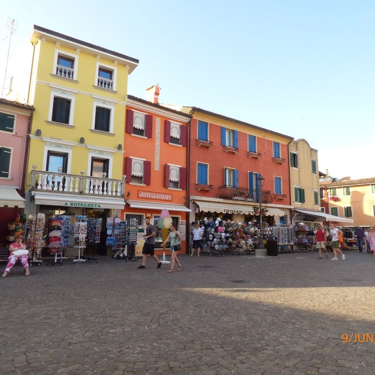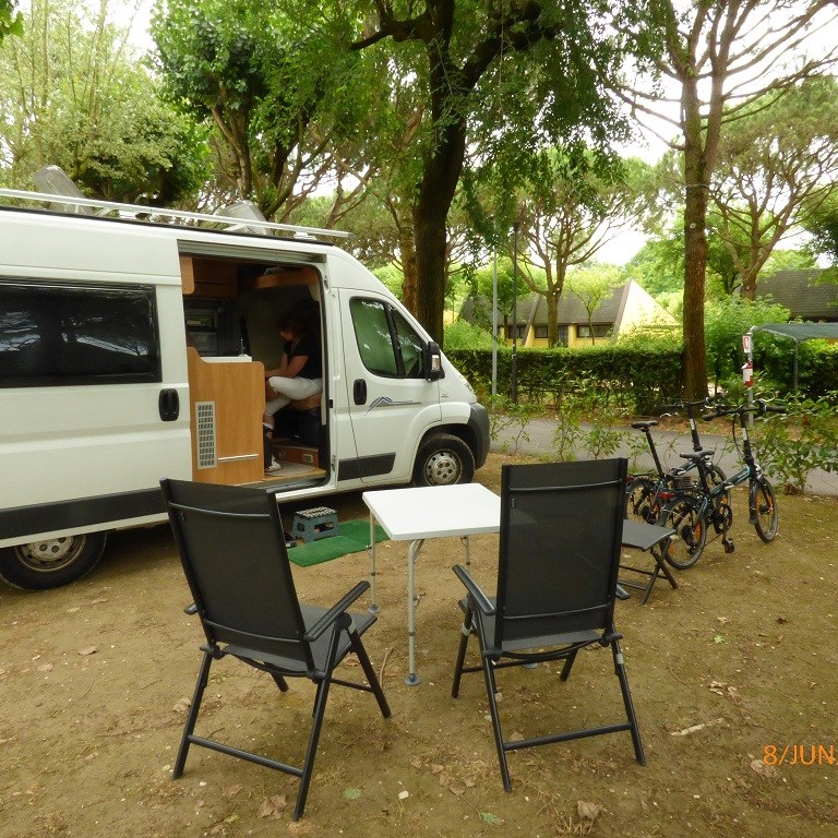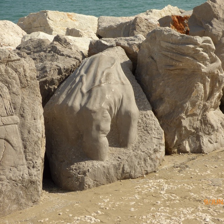 Der hier ansässige McDonald bietet im Bereich McCafé das Wiener Frühstück an. Das beinhaltet nicht nur einen starken Kaffee sondern auch richtig knackige Kornspitzen. Richtig gut gestärkt geht es weiter nach Eraclea. Dort sind wir mit dem Platz im Schatten sehr zufrieden. Kurzes Verschnaufen und dann radeln wir erstmal zur Gelateria unseres Vertrauens. Wie immer schmeckt das Eis außerordentlich gut. Nach dem Frühstück schauen wir uns Caorle an. Wir finden eine farblich schön zusammengestellte Innenstadt mit netten kleinen Boutiquen. Ganz besonders ist uns dabei „Blanc du Nil“ mit dem komplett in weiß gehaltenem Bekleidungsangebot aufgefallen. Auch die Kaimauer kann mit Sehenswertem aufwarten. Die in Stein gehauene Hand ist nur ein Beispiel aus den Kunstwerken entlang der Promenade. Die Palme mit der besonderen Frucht erinnert ein wenig an die Pflanze aus dem Musical „little shop of horror“……