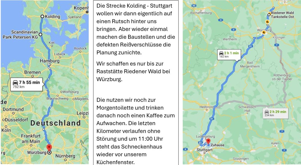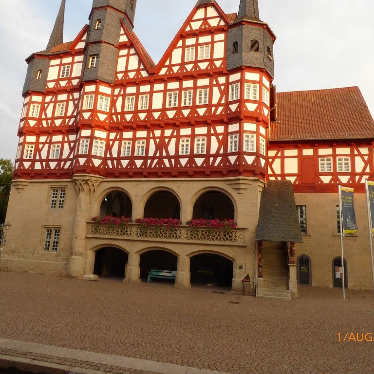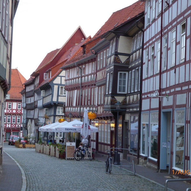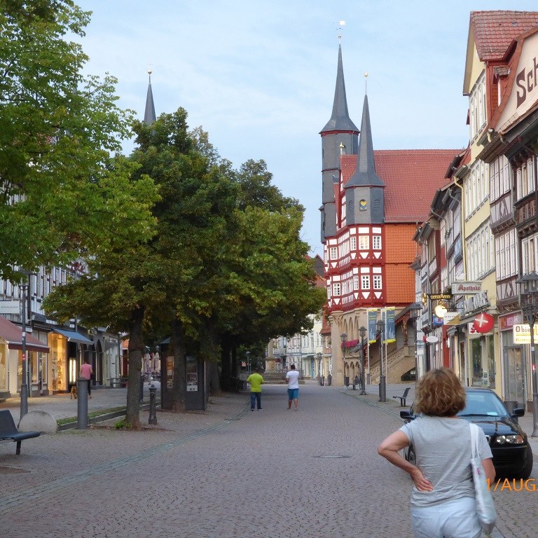 Wir starten am Mittwoch, 01. August ohne Frühstück. Nur die Bettwäsche und Reste aus dem Kühlschrank räumen wir noch ins Schneckenhaus und ab geht die Fahrt. Vor der Autobahn noch tanken und in Lauda-Königshofen setzen wir uns in Webers Cafe zum Frühstück. Die Fahrt wird durch mehrere Baustellenstaus verzögert. Bei der Einfahrt zur einspurigen Verkehrsführung klemmt der Reißverschluss mehr als einmal….. Wir lassen uns von der Hinweistafel „Die Fachwerkstadt“ an der Autobahn inspirieren und fahren in Duderstadt ab. Der Hinweis passt perfekt. Die Innenstadt mit den tollen Fachwerkhäusern macht echt was her. Die Generalprobe für die Reise ist mehr als gelungen. So kann es weiter gehen. Ohne Frühstück geht es wieder los. Wir folgen neugierig einer Hinweistafel zur Sehenswürdigkeit „Westöstlichen Tor“. Es bald klar, das es sich dabei um einen alten Grenzübergang handelt. Der nächste Hinweis am Waldrand „…. zu Fuß in 15min“ lässt unser Interesse dann doch abkühlen. Der Zeitplan und das Frühstück haben Vorrang.