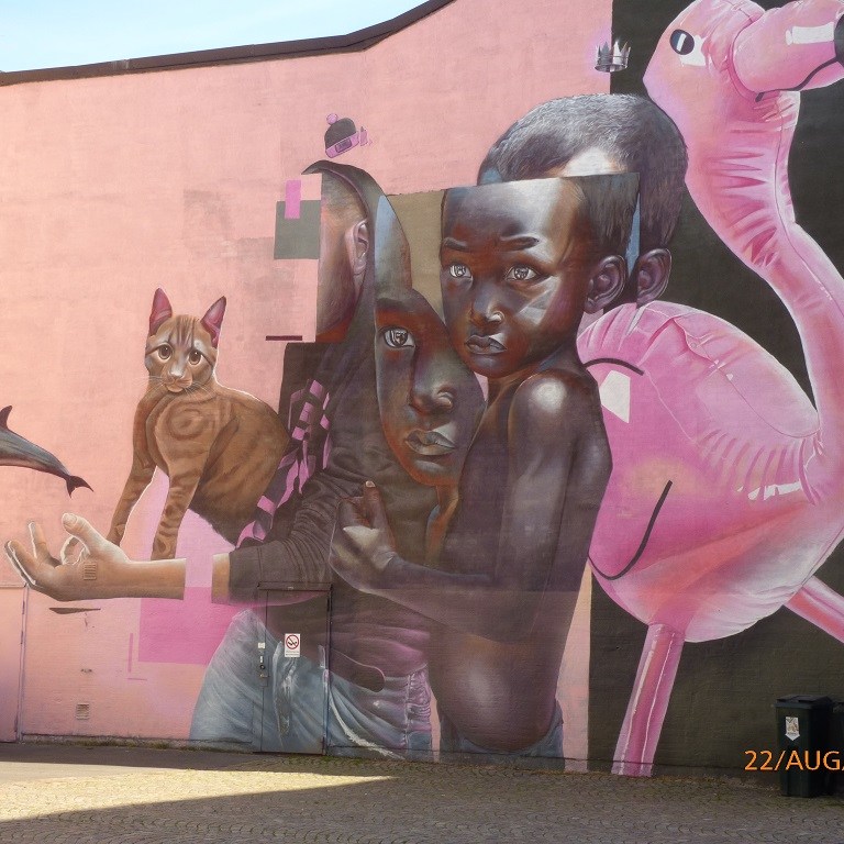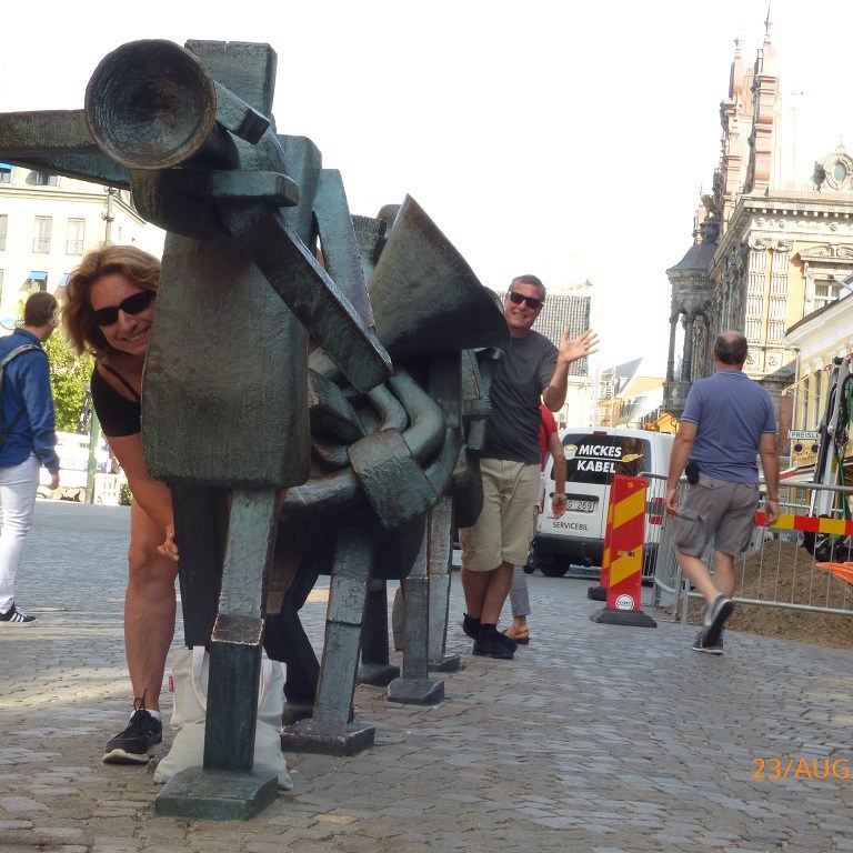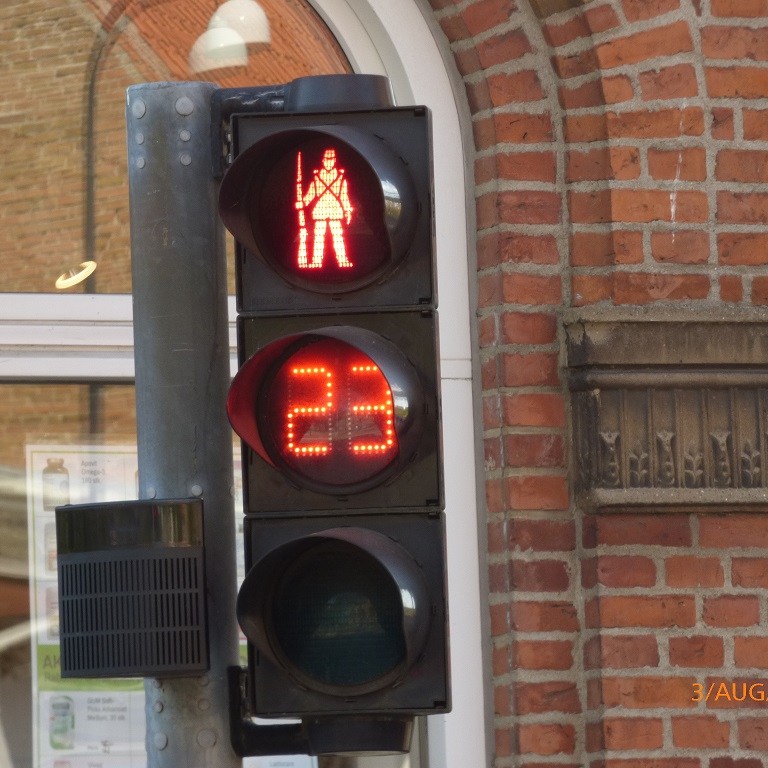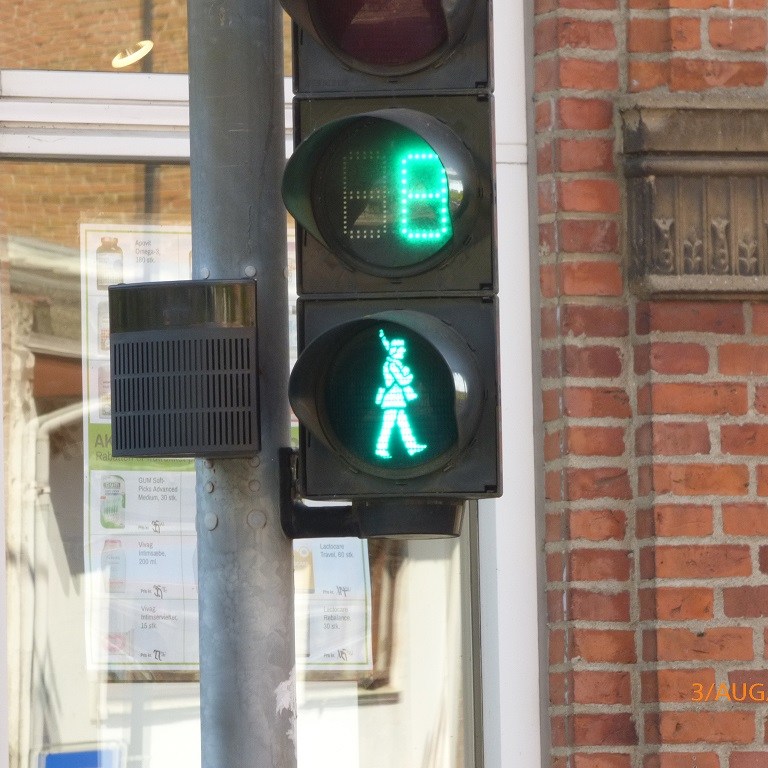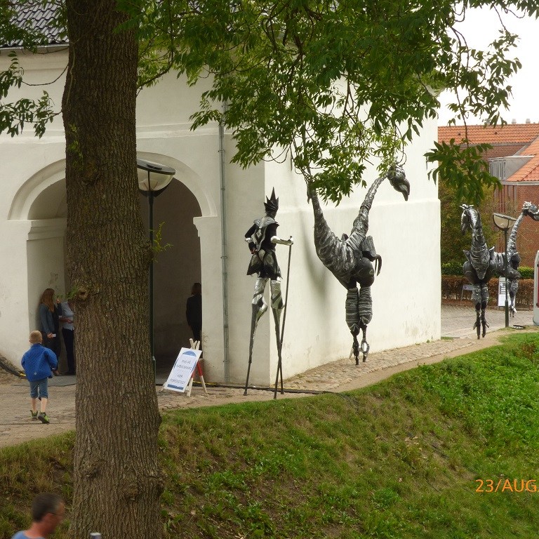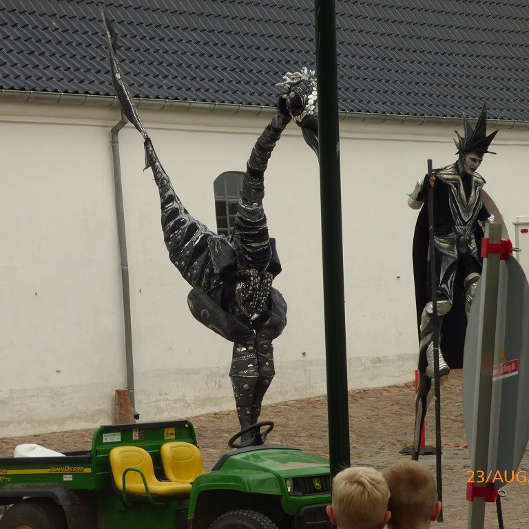 Am späten Nachmittag kommen wir in Kolding an. Die letzte Übernachtung auf der Rundreise. Wir finden im Dancamp Kolding City einen sehr gut ausgestatteten Campingplatz. Die haben sogar Toiletten für die ganz kleinen Camper. Zur Feier des letzten Tages wollen wir in der Stadt ein passendes Abendessen zu uns nehmen. Überall sind Vorbereitungen für das nächste Wochenende im Gange. Das ist leider zu spät für uns. Die Neugier treibt uns aber trotzdem zum Koldinghaus, denn das ist auch irgendwie einbezogen. Plötzlich kommt Leben in den Innenhof. Komische tierische Laute aus Richtung der fürs Festival benötigten Container erregen unsere Aufmerksamkeit. Dann kommt eine Herde riesiger schwarzer Stelzenvögel um die Ecke. Die Schreie ähneln derer von Jungtieren die gehörigen Hunger haben. Ein Hüter auf Stelzen treibt die kleine Herde in Richtung Innenstadt. Ein wirklich effektvoller Schlusspunkt unserer Rundreise.