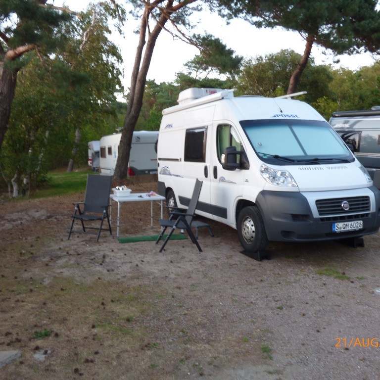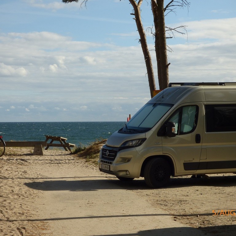 Den ersten Stopp zur Kaffeepause mit einem tollen Softeis legen wir in Bastad ein. Zunächst schauen wir uns am Strand die mutigen Camper auf dem Sand an. Nach zwei Fahrzeuglängen verlässt mich der Mut, wir drehen und suchen uns lieber einen Parkplatz auf asphaltiertem Untergrund. Ein kleiner Strandspaziergang vorm Eis und danach noch eine Runde im Ort. In Lerbergets finden wir eine gute Bleibe für die Nacht.