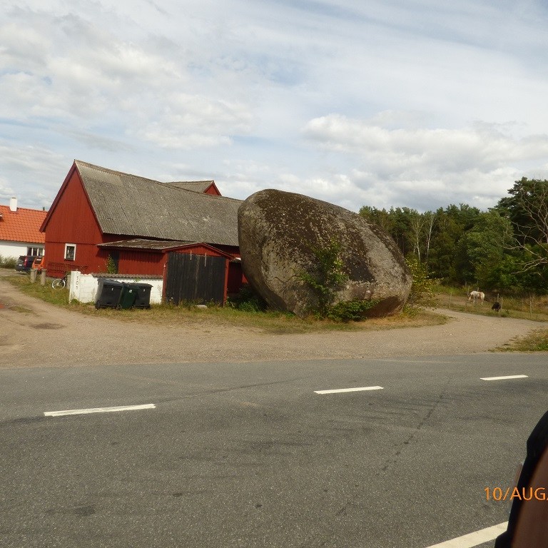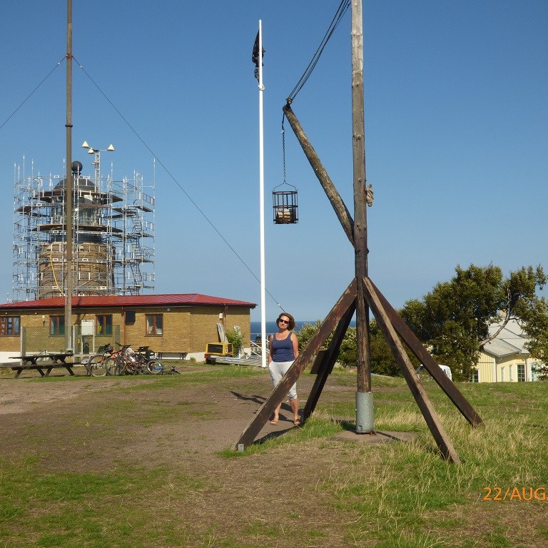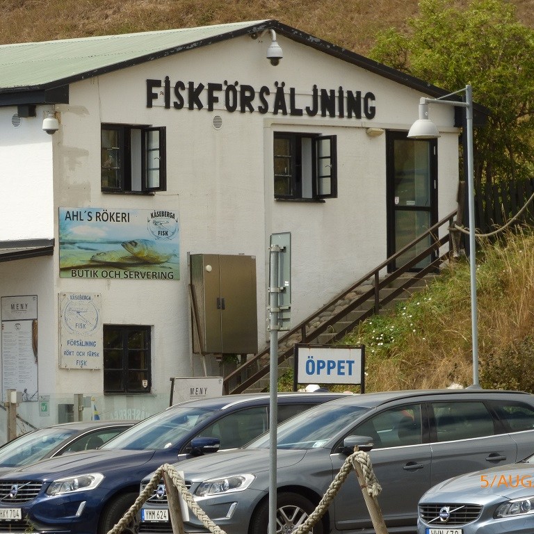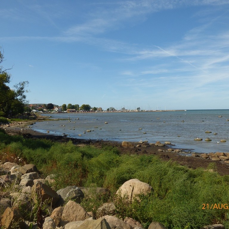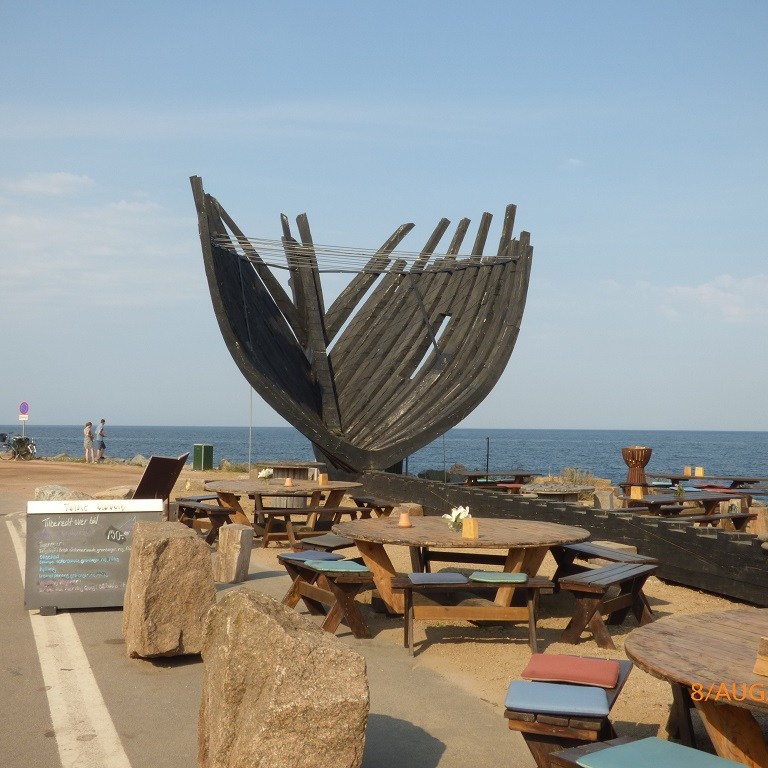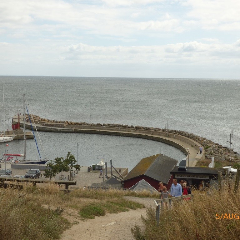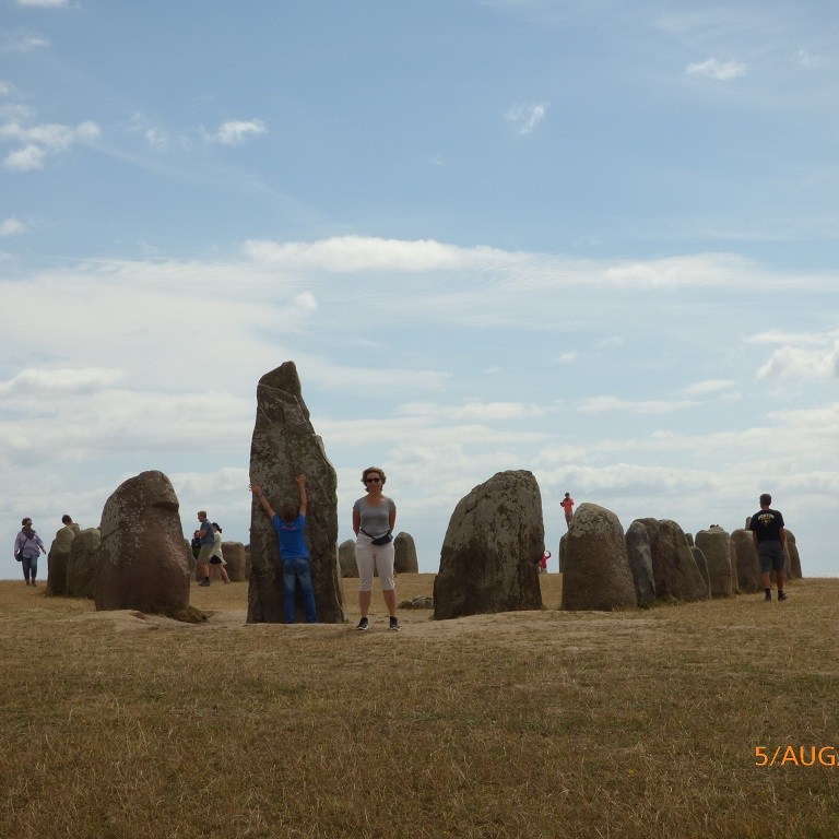 Am nächsten Morgen fahren wir nochmal mit den Rädern zum Strand. Gleich die erste Aufnahme ist geeignet für Urlaub im Wohnmobil zu werben. Das ausgebuchte Löderups Strandbad ist bei Tageslicht betrachtet eher überfüllt und wir sind mit unserem Provisorium sehr zufrieden. Dann wagen wir uns auf die Hauptstraße in Richtung der Ortschaft Käsberga. Ohne Räder ersteigen wir den Hügel um uns die Formation der „Ale´s Steine“ anzuschauen. Hier ein Auszug der Wikipedia Beschreibung: „Die aus 59 Steinen bestehende Schiffssetzung liegt auf einem etwa 37 Meter hohen Hügel direkt an der Ostseeküste beim Ort Kåseberga im Süden Schonens. Der Küstenabschnitt ist von einer steil zum Meer abfallenden Abbruchkante geprägt. Die 0,5 bis 1,8 Tonnen schweren Steine sind in Form eines Schiffes angeordnet.“ Vom Hügel der Steine geht es dann hinunter zum Fischerdorf.