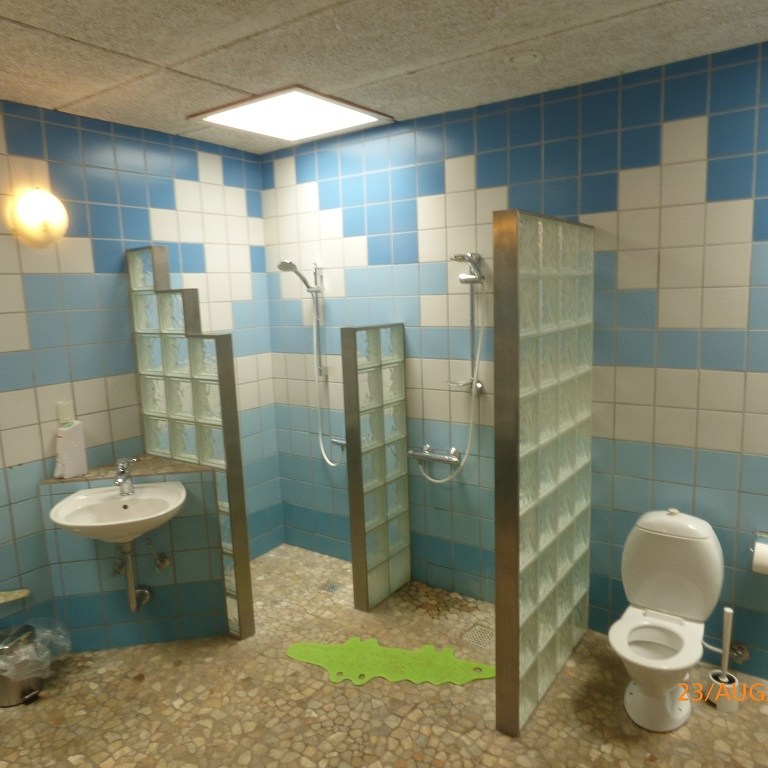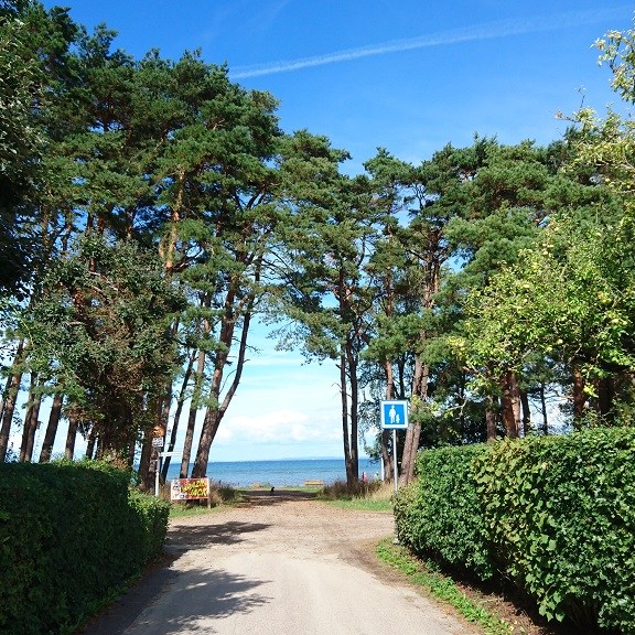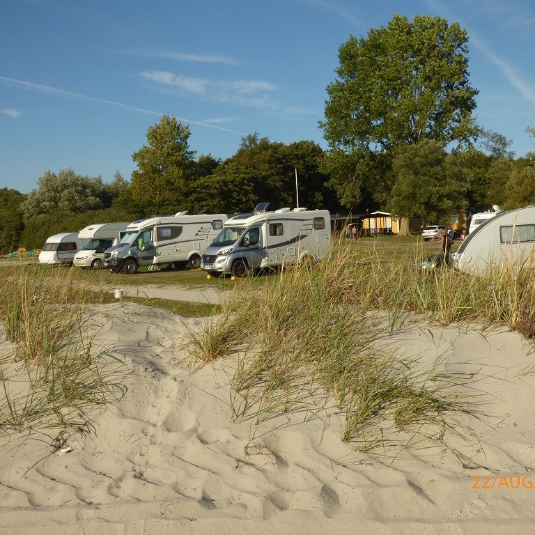 Ein paar Kilometer weg hat das NAVI den Campingplatz des Löderups Strandbades ausfindig gemacht. Aber auch dort ist leider ausgebucht. Auf dem Rückweg zur Hauptstraße entdecken wir einen Mini-Hinweis. Diesen Platz gibt es wohl noch nicht lange. Die Verteilung der gelben 32 Ampere Stromverteiler und auch die beiden Container für Duschen und Toiletten machen einen sehr provisorischen Eindruck. Der Betreiber erzählt uns dann auch, dass er mit dem Platz diese Saison erst angefangen hat und ihn von Zeit zu Zeit ausbauen möchte. Für unsere Zwecke auf jeden Fall ausreichend. Bei unseren sportlichen Aktivitäten haben wir schon schlechter geduscht… Nach dem Einrichten spazieren wir nochmal über den Hügel zurück zum Löderup Strand.