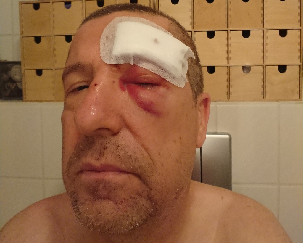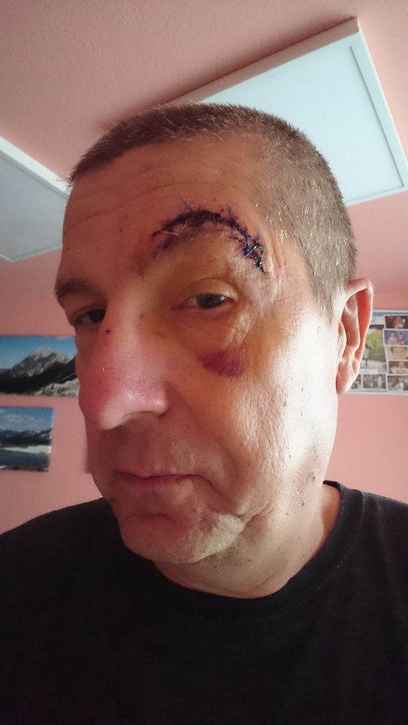 Die Bilder zeigen den „Heilungsverlauf“ zunächst nach der ersten Wundversorgung im Krankenwagen. Zwei Tage später zuhause mit dem Pflaster über der genähten Platzwunde. Nach einer Woche soll die Wunde an die Luft und der Termin zur Entfernung der Nähte gemacht werden.